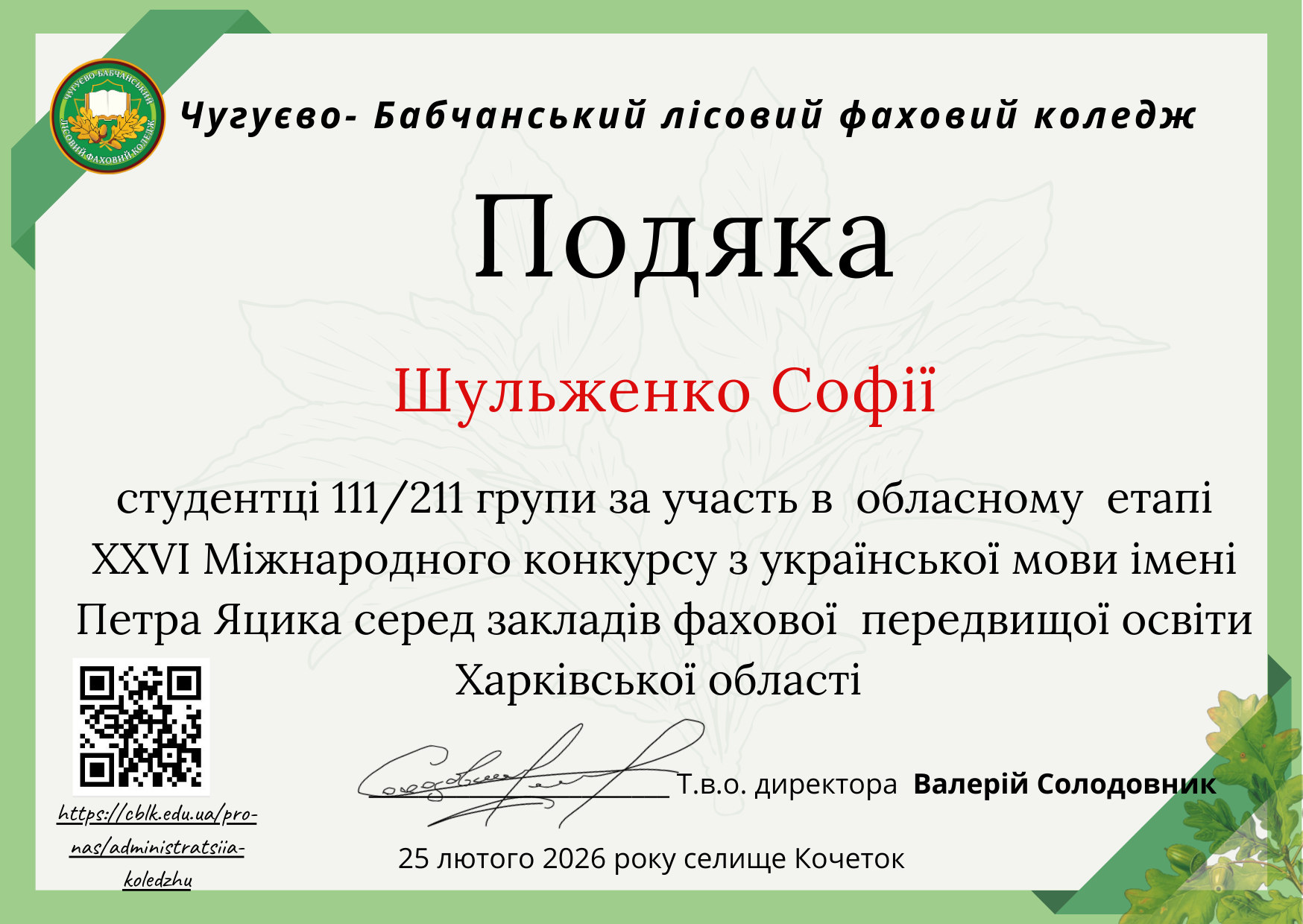 21 лютого 2026 року, у День рідної мови, із метою підтримки обдарованої молоді, утвердження української мови як державної та піднесення її престижу серед здобувачів освіти Харківської області відбувся обласний етап XXVI Міжнародного конкурсу з української мови імені Петра Яцика.
