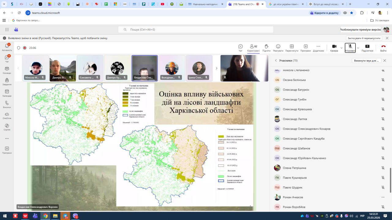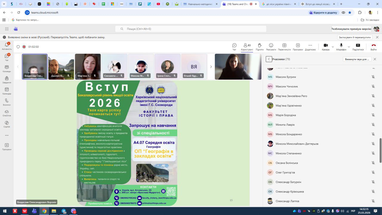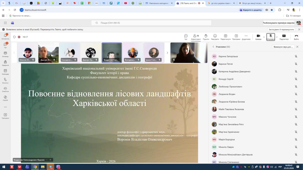 викладач кафедри суспільно-економічних дисциплін і географії факультету історії і права ХНПУ імені Г.С.Сковороди Воронін Владіслав Олександрович висвітлив питання актуальної та болючішої для кожного з нам теми — відновлення лісових ландшафтів після воєнних дій.
