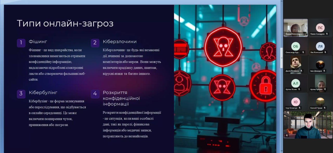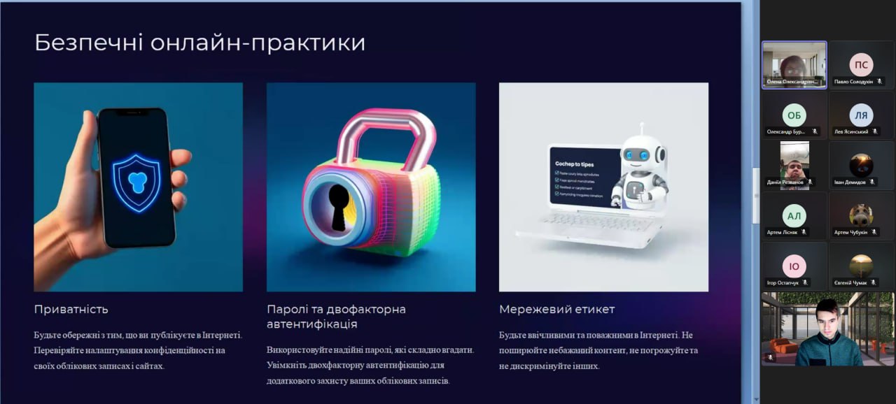 Важливим питанням, яке було розглянуто, це питання кібербулінгу. Як вижливо уникати цього, які дії потрібно виконувати при виявленні данного явища, які шляхи його подолання.