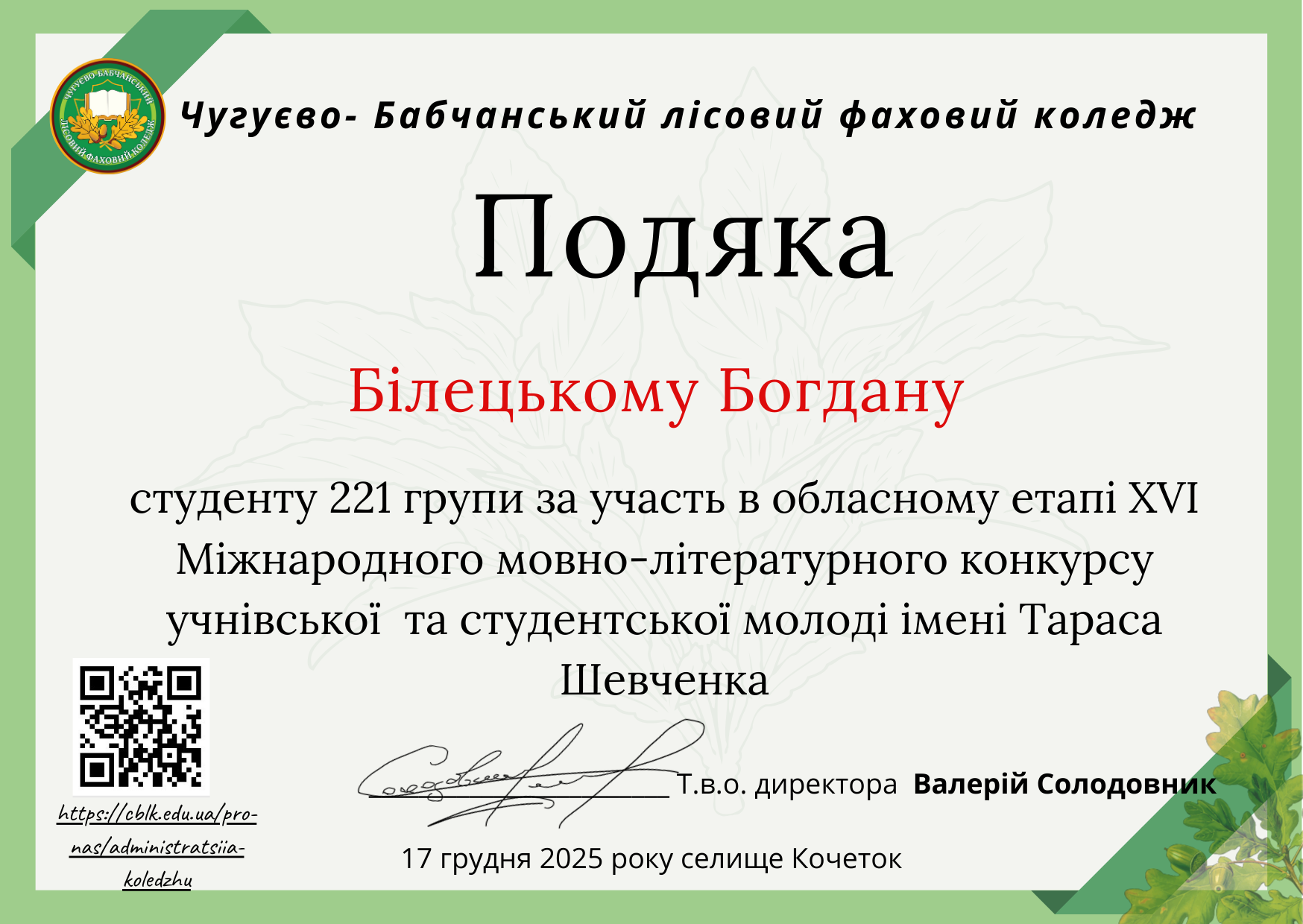 13 грудня 2025 року відбувся другий (обласний) етап XVІ Міжнародного мовно-літературного конкурсу учнівської та студентської молоді імені Тараса Шевченка.
